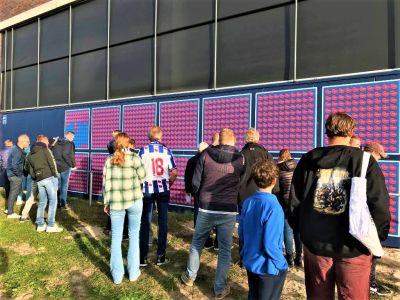 Ut loopke fan ut McDonalds parkearterrein foëlde al heel anders an as nòrmaal. Overal kleine ploechjes suppòrters. Bij ut Abe Lenstra Stadion un hele groate wall of fam met allemaal pompeblêdsjes, met dêrop de namen fan de Gouden súppòrters. Ut was mij te druk om tussen in te gaan staan en oans namen op te soeke.