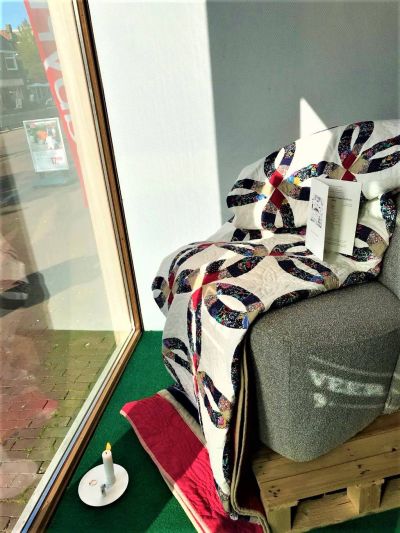 September 2020, we pakken het quilt wat ze zelf maakte en vorige week bij ons bracht van zolder....een mini museum, een plekje in de etalage, ze zou vast even binnen zijn gelopen om te zeggen hoe mooi de etalages er weer bij staan.