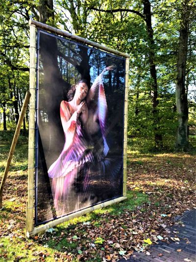 Van de Puttelaar: ‘Bij de foto-expositie werkt de omgeving intensief mee, de foto’s worden buiten op groot doek getoond en interfereren met de natuur. Het lijkt een muziekstuk waar je onderdeel van wordt. Het heeft iets overweldigends, iets groots, een epos, een opera, als een soort performance. De beelden gaan de synergie aan met de natuur, met de wind, de geluiden en het licht dat door de bomen op, door en achter het beeld straalt.’