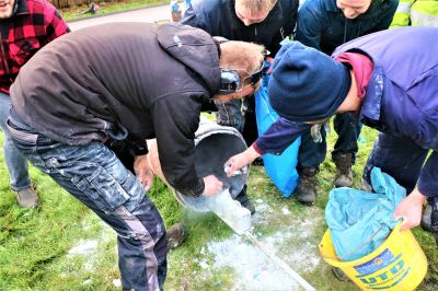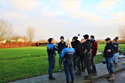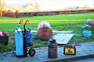 Kort voor de komst van de handhavers heeft Sietse nog een enthousiast verhaal verteld over het carbidschieten.”Wij dogge dit mei ús fêste ploech en de buurt. Dy mateploech bestiet út in man as tritich en sa binne wij hjoed wat mei mekoar dwaande. De leeftyd fan ús mateploech is fan 18 oant 30 jier, mar bij it karbidsjitten komme der ek wol lju dy’t al 50 oant 60 jier binne. It hiele plak fynt it machtich dat wij dit sa dogge. We hawwe ek fergunning foar de molkbussen, mar net foar it gruttere spul. We sjogge wol hoelang’t soks duorret”, is Sietse wel zo eerlijk om te vertellen.