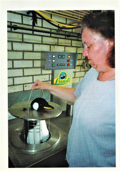 Tien jaar later is de vogelwasmachine, het 75.000 gulden kostende apparaat wordt hoe wrang ook, geschonken door Elf Petroland, niet meer weg te denken uit de Fûgelpits. Gaatske Wiersma:“Eigenlek is de waskmasine mei de reden west dat wy ferhúzje moasten. Troch de komst fan de wasmasine en troch ús jierrenlange ervaring waard it mooglik om 85% fan de oaljeslachtoffers te rêden. Yn wêzen is dy masine mar in hiel ienfâldich apparaat. We dogge de fûgels yn in roestfrij stielen kuorke, dat foar de helte iepen kin. We sette de wjukken fêst, it kopke kin troch in frij gatsje nei bûten ta stekke en sette it gehiel yn de masine. Tsien sproeiers dy’t oan in stange fêst sitte draaie om de stilsteande fûgel hinne. Earsrt mei sjippe, mei Dreft want dat foldocht it bêste en dan neisproeie met wetter. Troch de goeie resultaten mei de fûgelwasmasine ûntstie der romtegebrek yn Anjum.”