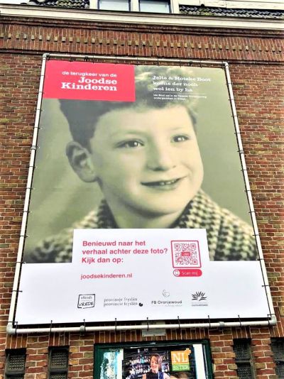 Ook in Sneek, op de hoek Jousterkade/Oosterdijk hangt zo’n portret. Het is een foto van Ids Boot. De tentoonstelling ‘Wy koenen der noch wol ien by ha’, toont tegelijk de gastvrijheid van Friese onderduikfamilies, die ondanks alle gevaren de kinderen opnamen in hun midden.