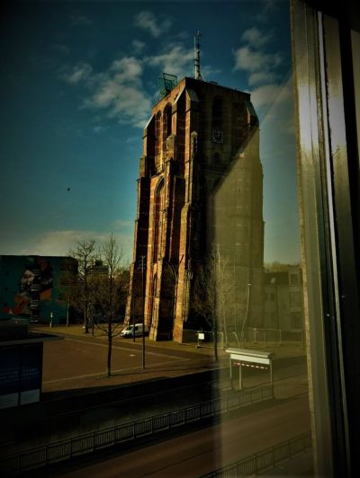 Fanmòrren in Tresoar an de Butterhoek in Liwwarden weest. Fanút ut ut gebou appte ik un foto fan dy skeve Oldehove naar myn maten in Sneek. Kreech futdaleks reaksy: ‘Hest der teugen an sitten...?’ Kiek dat is moaie húmòr, fyn ik. Deed oer-Liwwarder Hindrik ten Hoeve ok altyd, ut speldsje dat ik oait fan um kreech met as tekst ‘Ja de Oldehove staat skeef NOU EN?’ bewaar ik as un waardefol besit.