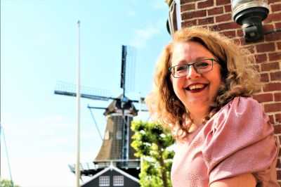 De bovenste foto maakte ik fanmòrren in un toen ok al sonovergoaten Woudsend. Stralende Tessa met rood-getuite lipkes en de moalen fan Woudsend op 'e achtergroan.