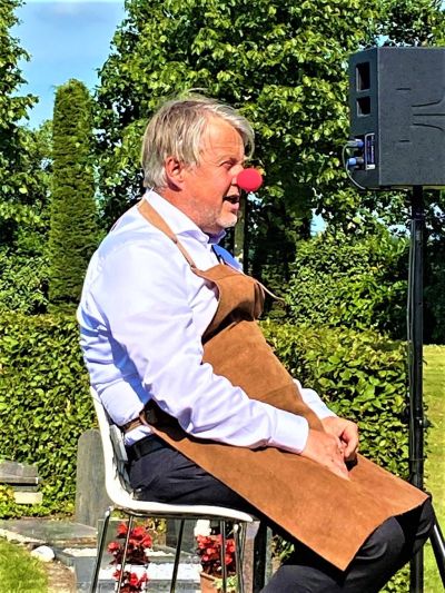 Als laatste kwam spreker, ondernemer en cabaretier Milo Berlijn aan het woord of beter ging de dialoog met het publiek aan. Weergaloos goed! Wat Berlijn vooral deed was de gasten een spiegel voorhouden. Zo ontstond er een ‘dat is inderdaad waar-gevoel’ en was de herkenning groot. Gastvrijheid, samenwerken en verbinden zijn juist in de uitvaartbranche heel belangrijk. Dat de gasten een rode feestneus kregen uitgereikt maakte dit feest compleet en zeker niet ongepast op deze plaats.