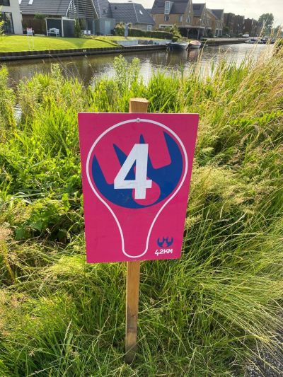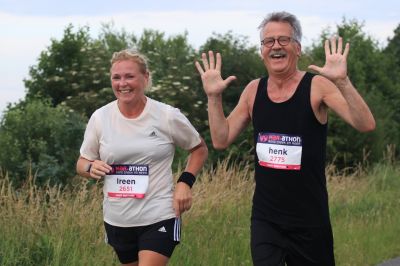 As un mokerslach foëlt de Akwadukttunnel an, de kilometers beginne te tellen. “Ik ga dood”, sist Ireen. Nyt dat ik har loof en ut helpt ok nyt. We dribbele deur en lade oans op foar ut laatste deel in’e stad. Un gloarieuse intocht at we de Waterpoartsgracht opdraaie en ut blauwe finishdoëk siën. De gele Van Gogh sonnebloemen wurde dankber in ontfangst nommen. De klòk staat stil op 1 uur en 12 minúten. Un eufoarys gefoël maakt sich fan oans meester. Domwech gelukkech an’e rane fan ut Martiniplein!