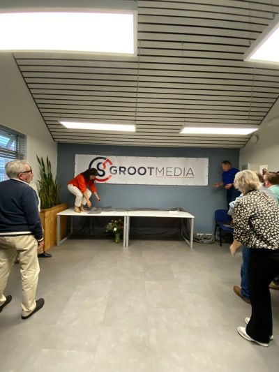 Naast teruch-en foarútsiën toespraken fan Marianne en Ying was ut onthullen fan ut nieuwe logo: GrootMedia ok un hoogtepuntsje. As metwerkers hewwe wij Marianne & Ying un prachtege GrootSneek ferhalenbank cadeau deen. Na un lekker stamppòtbuffet binne we met de hele ploech naar un foarstelling fan De Tocht in ut Friso Theater weest.