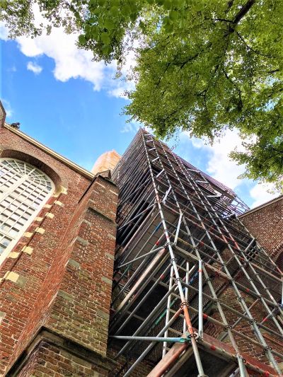 Op dit moment staat de koepel fan'e Groate Kerk in Sneek in'e steigers. |