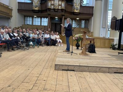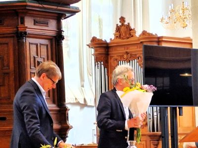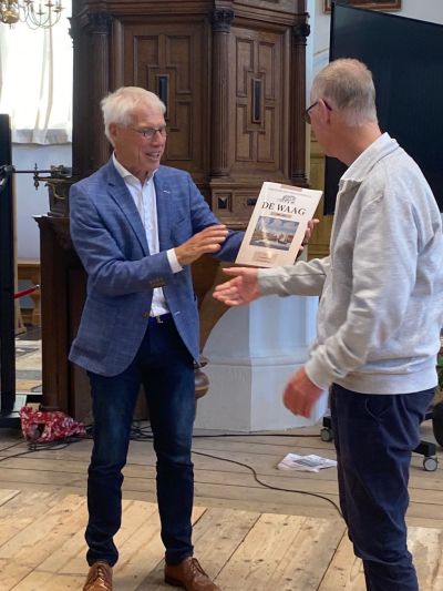 Henk Stalman en Joop Boom kregen un earste eksemplaar fan ut júbileumnummer fan De Waag anboaden. Der waren su’n 300 minsen anwezech in ’e kerk.