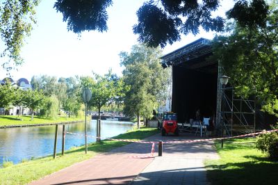 SNEEK- De opbouw van een groot podium op de Westersingel, vlakbij Theater Sneek, is vandaag voltooid. Zaterdag a.s. zal hier o.a. het OBW Grachtenconcert worden gegeven.