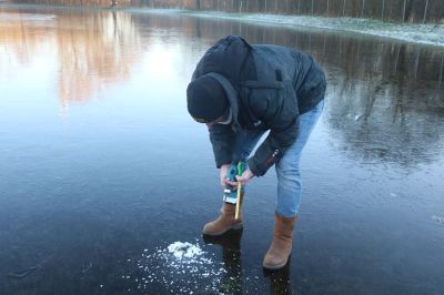 Ondertussen was Sjoerd Nota druk bezig met de metingen. De volgende stap die genomen werd was het hakken van enkele gaten in het ijs. “We hebben aan de kopse kanten enkele gaten in het ijs gemaakt, zodat de waterdruk onder het ijs heen en weer kan gaan, anders knapt de ijsvloer helemaal kapot”, vertelde Nota.