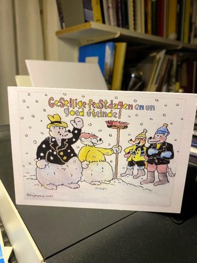 Al met al: ut ritme wear aardech te pakken! Ondertussen siën ik naar de allermoaiste Nieuwjaarskaart dy’t ik in desember kreech. Un Sneker Nieuwjaarskaart fan kunstenaar Theo Jaasma. Un prònkje! Sukke kaarten koester en bewaar ik.