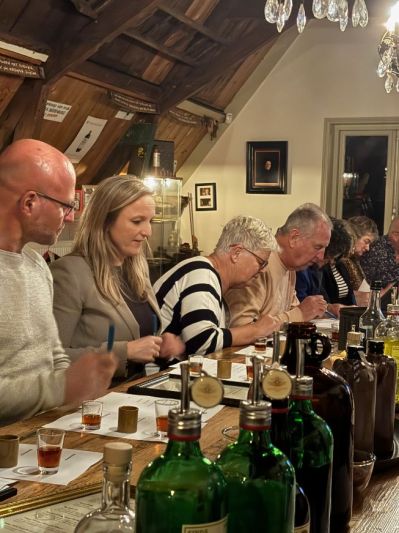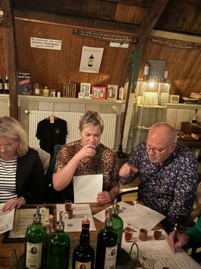 Na de lezing van Hans Koppen gingen de Sneekologen in spé naar de Weduwe Joustra om daar letterlijk aan de Beerenburg (‘met twee e’s!) te ruiken. En uiteraard hun kennis te vergroten over het unieke Sneker bedrijf.