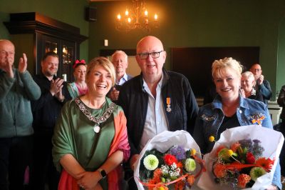 Ferfòlgens naar Restaurant Onder de Linden. Dêr op’e bovensaal kregen Fokko Dam en Trea Dam-Elsinga ok un lintsje fan’e Koaning. Moai om te siën hoe’t Fokko syn emoasy’s de frije loop liet. Ut echtpaar het en set um nòch altyd in foar oans stad.