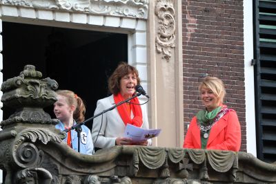 De traditionele aubade in de Marktstraat trok vanmorgen ook vandaag weer een paar honderd mensen naar het Sneker stadhuis. Daar op het bordes nam burgemeester Jannewietske de Vries de aubade af voor Zijne Majesteit de Koning, die vandaag zijn 57ste verjaardag viert. Koning Willem Alexander doet dat met de Koninklijke familie in Emmen.
