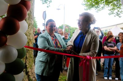 SNEEK- Sinds 1 mei van dit jaar draait het restaurant van Just JP aan de Wijde Noorderhorne in Sneek. Op 27 april jl. sloot het restaurant haar deuren van oude locatie aan de Leeuwarderweg in de Waterpoortstad. Vanmiddag opende wethouder Marianne Poelman samen met medewerkster Carlijn officieel de deuren van het prachtige nieuwe restaurant. Dat deden ze door een roze lint door te knippen. De andere medewerkers gingen vervolgens achter de wethouder en hun collega aan over de drempel van het prachtige nieuwe onderkomen.