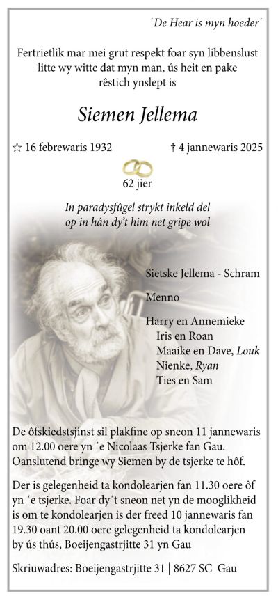Fandaach staat in’e LC de overlijdensadvertênsy fan Siemen Jellema. Syn doopnaam was Simon en in ut Frys en Snekers ‘Simen’. In júny 2020 mocht ik Simen interviewe foar de Friesland Post. Spesiaal nou denk ik graach and y ontmoeting werom. Na ut interview un fers, un oade, dy’t ik foar Simen skreef.