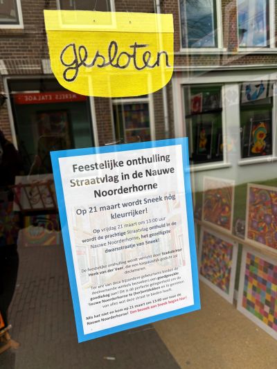 SNEEK - Op vrijdag 21 maart wordt om 13.00 uur een prachtige ‘Straatvlag’ onthuld in de Nauwe Noorderhorne, het gezelligste dwarsstraatje van Sneek. Daarmee krijgt de stad een kleurrijke toevoeging!