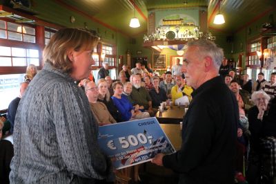 Vanavond was de laatste lezing in samenwerking met de ‘Stichting Sneek viert 80 jaar Vrijheid’. Na afloop van de voordracht overhandigde bestuurslid Bert Koopmans van de Stichting een cheque van €500 aan Peter van der Meeren. Hij gaf op zijn beurt de cheque over aan voorzitter Kim Kampan van LSC 1890, voor het restauratiefonds van het monumentale tribunegebouw.
