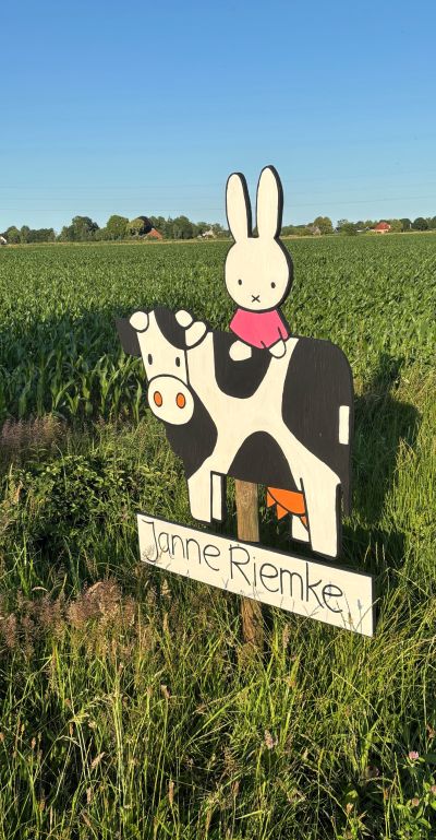 An ’e kant fan ’e Pasfeardyk, bij Loënga, twee prachtege poëtise Frysktalige keunstwerken dy’t de geboarte fan Janne Riemke ankondege. De skoanheid fan ut Friese plattelaan. Ik hou der fan, ok al bin en bliëf ik un stadsjonge.