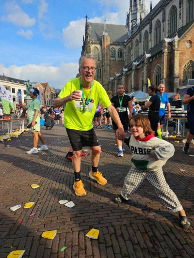 Dat is mar 1 kant fan’e medalje, de kille tiden. Mar nòch feul moaier was dat ik de laatste meters met myn oudste kleinsoan ( 4 jaar) over de finishlijn op’e Grote Markt fan Haarlem draafde. Dát is wêr’t ut om draait! Onfergetelek su moai.
